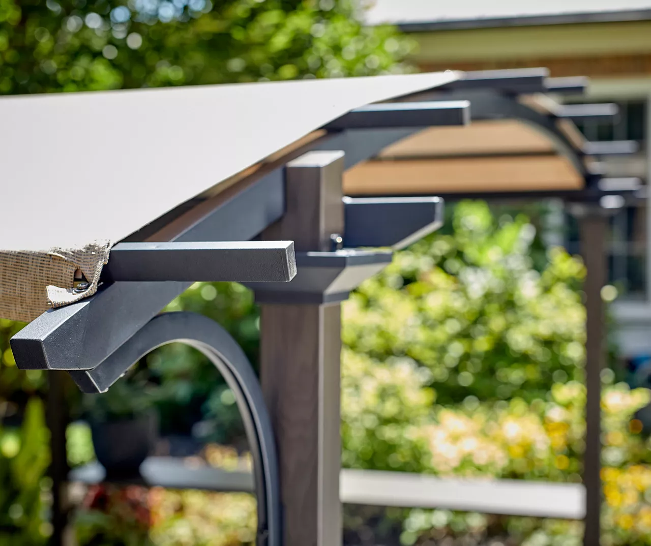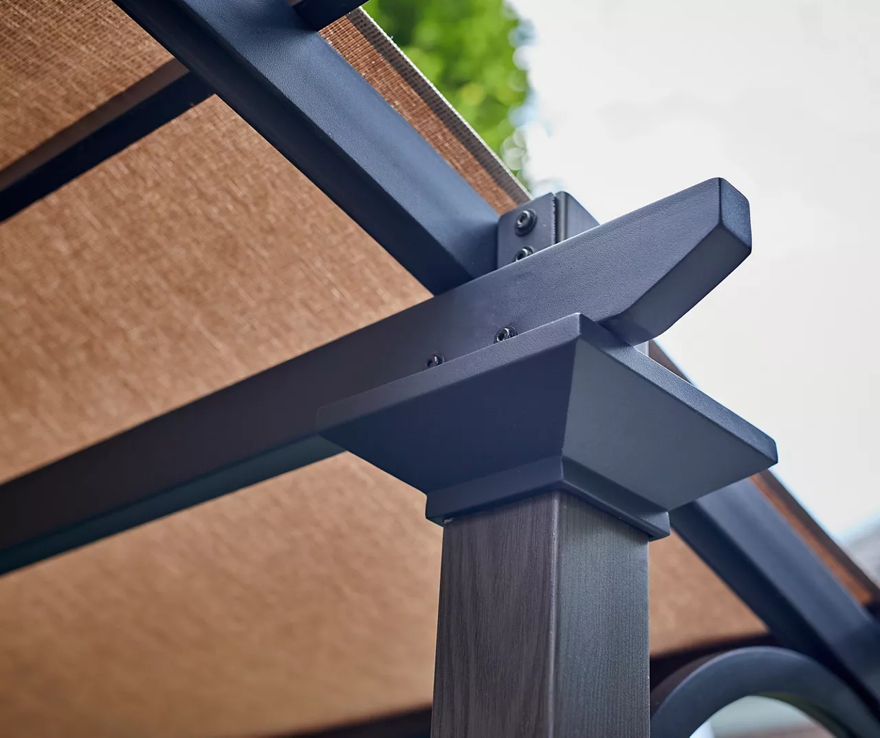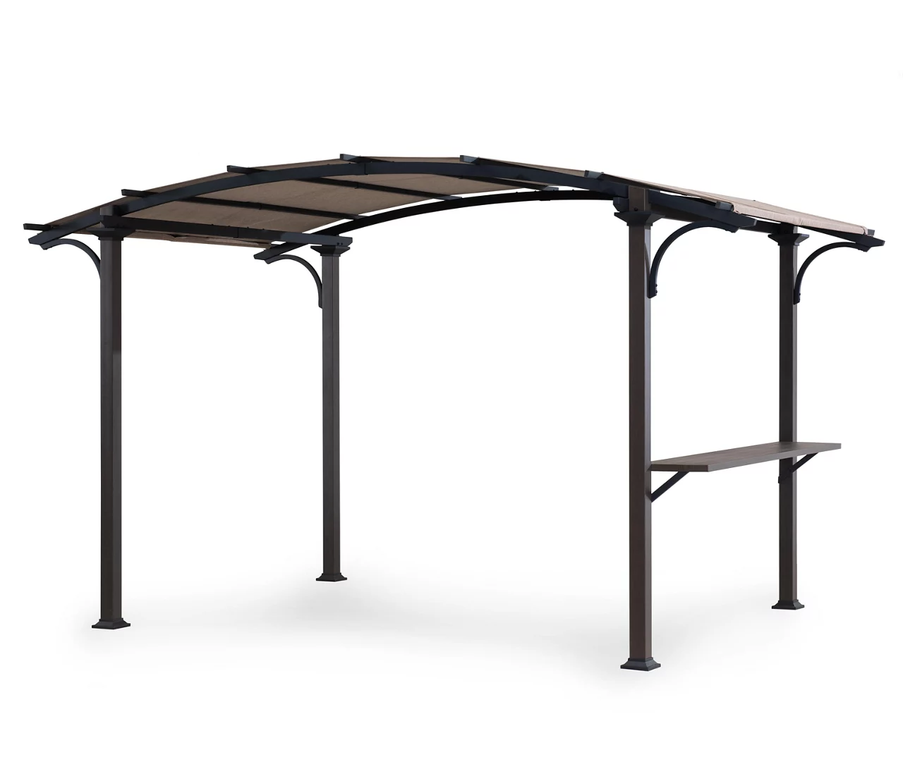 Relax in the sunshine or spend summer nights underneath the Broyhill Capilano Pergola. The light-filtering sling canopy provides shade and comfort while allowing breezy airflow as its timeless style, curved details make it look like a custom-built structure. Entertaining-ready with a built-in bar with a simulated wood surface, this elevated Pergola in a substantial size accommodates a variety of dining and seating arrangements in your outdoor living space.