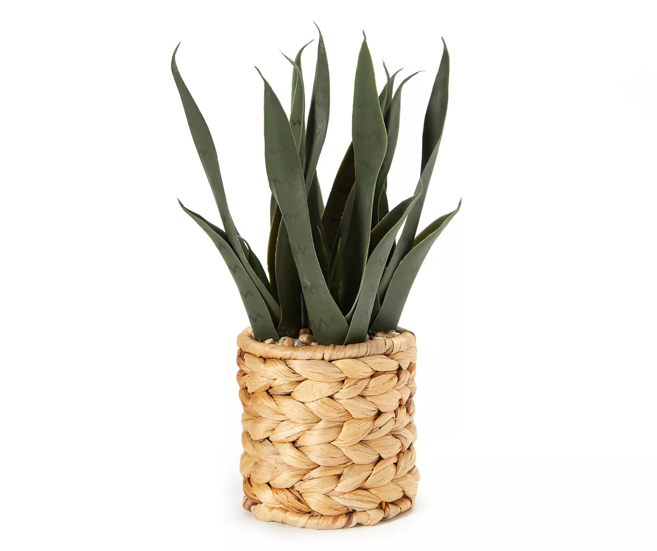 Add a nature’s touch to your home without the need of a green thumb displaying this artificial plant. A realistic snake plant is featured in a rock bed and housed within a round woven basket base. This maintenance-free plant is perfect for showcasing on a mantel, table or shelf.