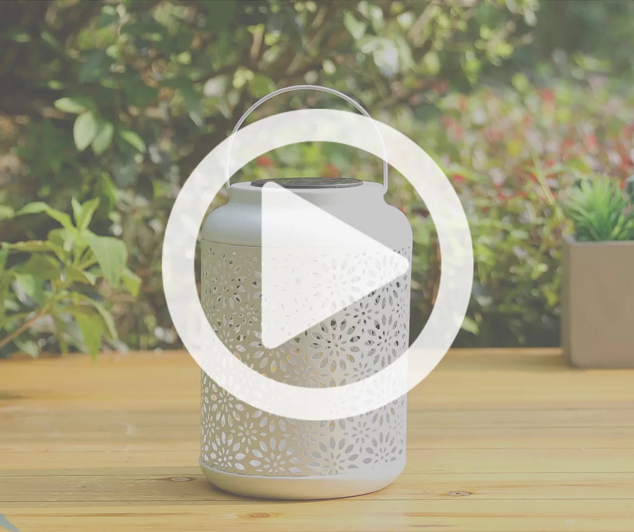 This classic solar lantern set with delicate flower cut-outs create intriguing graphic shadows, adds artisan beauty and flickering drama to your outdoor space. Bright warm white LED lighting charges throughout the day to automatically turn on at night and off at dawn. Designed with a handle for easy carrying and hanging, this lantern set is a beautiful addition to a porch, patio or garden.